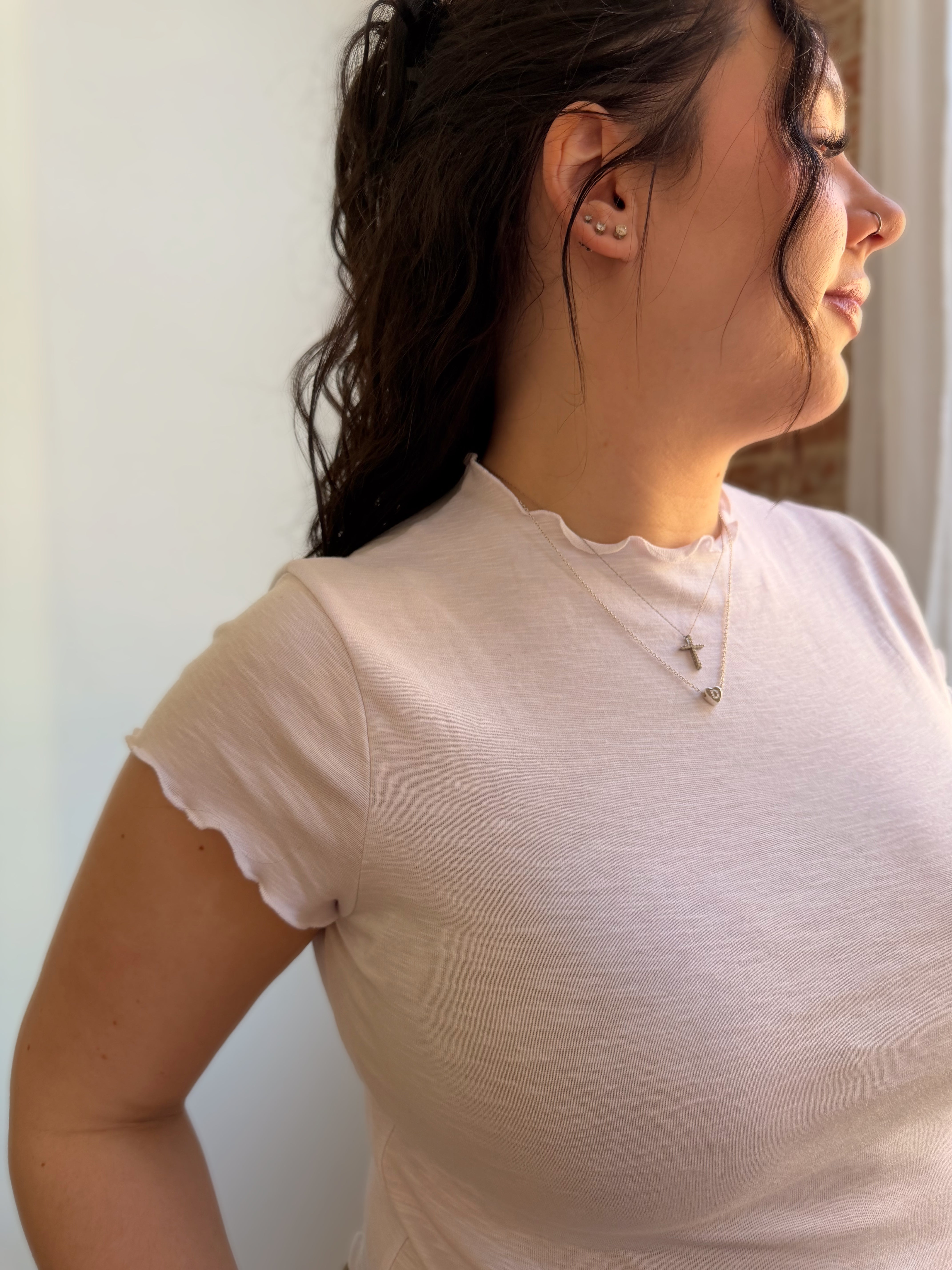 Delicate and dreamy, this fitted white baby tee features a signature lettuce edge trim. The soft, stretchy fabric hugs your frame perfectly while the scalloped hemline creates an effortlessly cute silhouette. Perfect for layering or wearing solo, this wardrobe essential pairs beautifully with everything from denim to skirts. A timeless piece that feels as good as it looks.