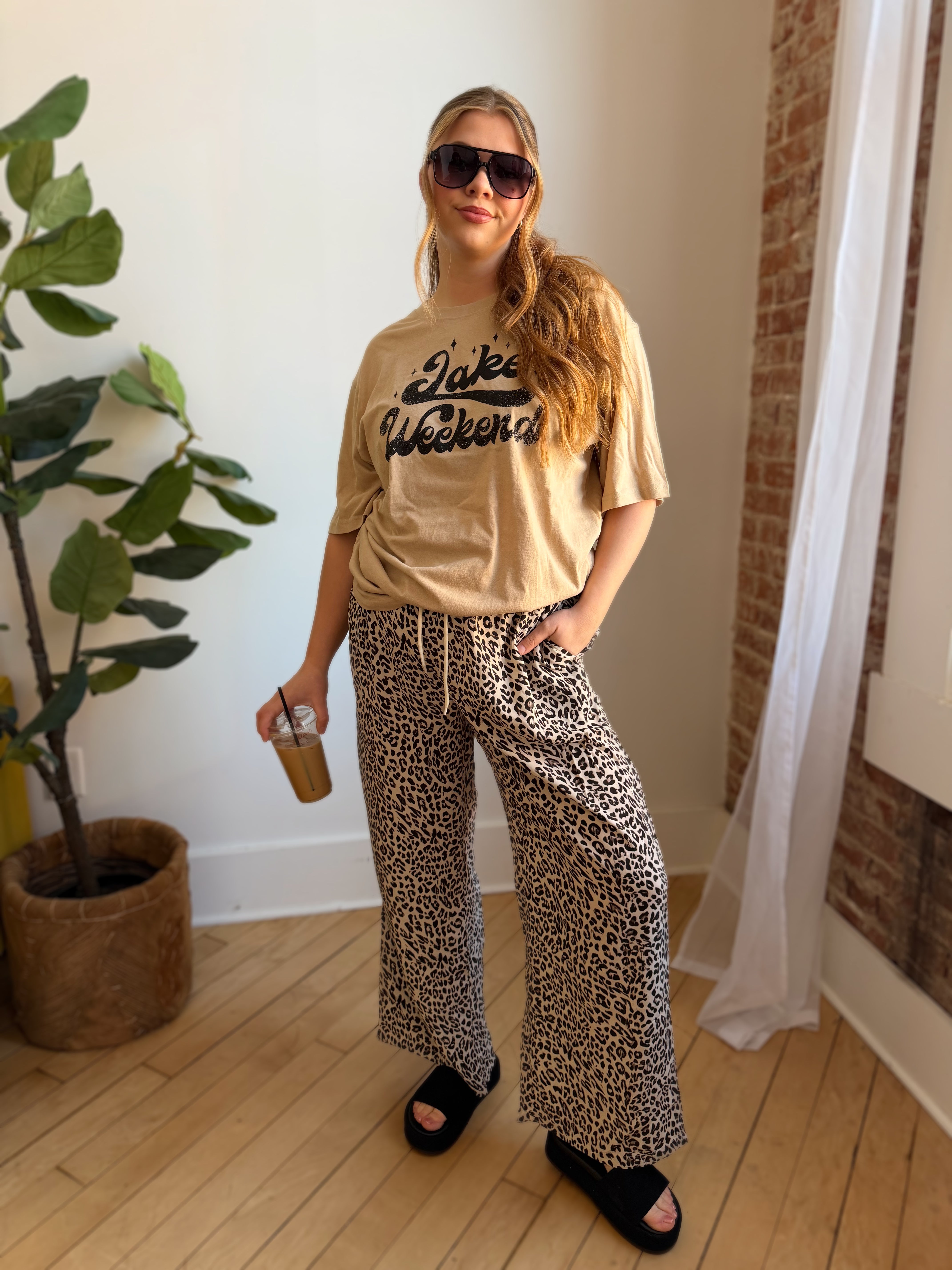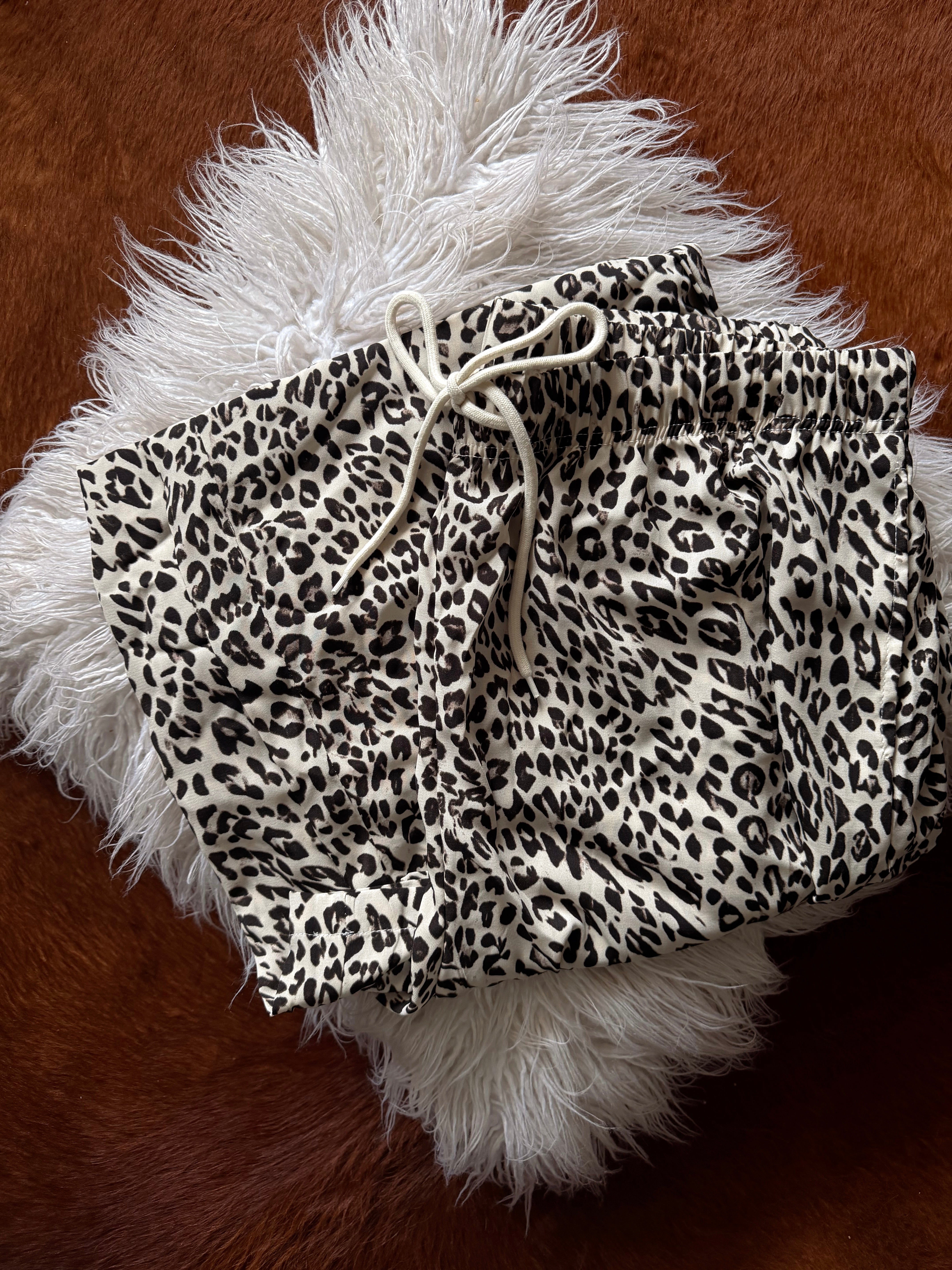 Effortless comfort meets bold style with these leopard print drawstring pants. The elastic waist provides a relaxed, adjustable fit that moves with you throughout the day. Classic leopard patterning adds a touch of wild sophistication to any casual wardrobe. Perfect for lounging, running errands, or creating an easy layered look. Pair with a solid tee or oversized sweater for understated edge.